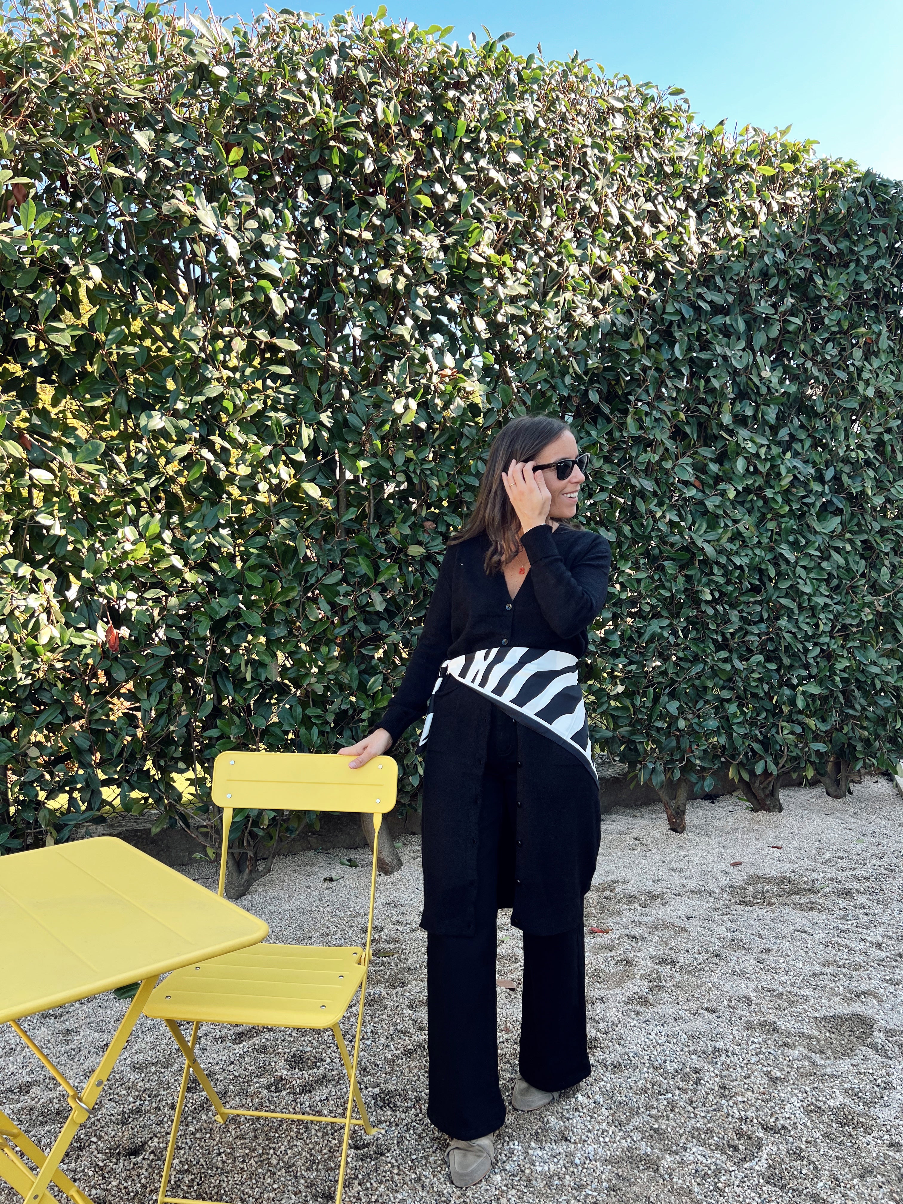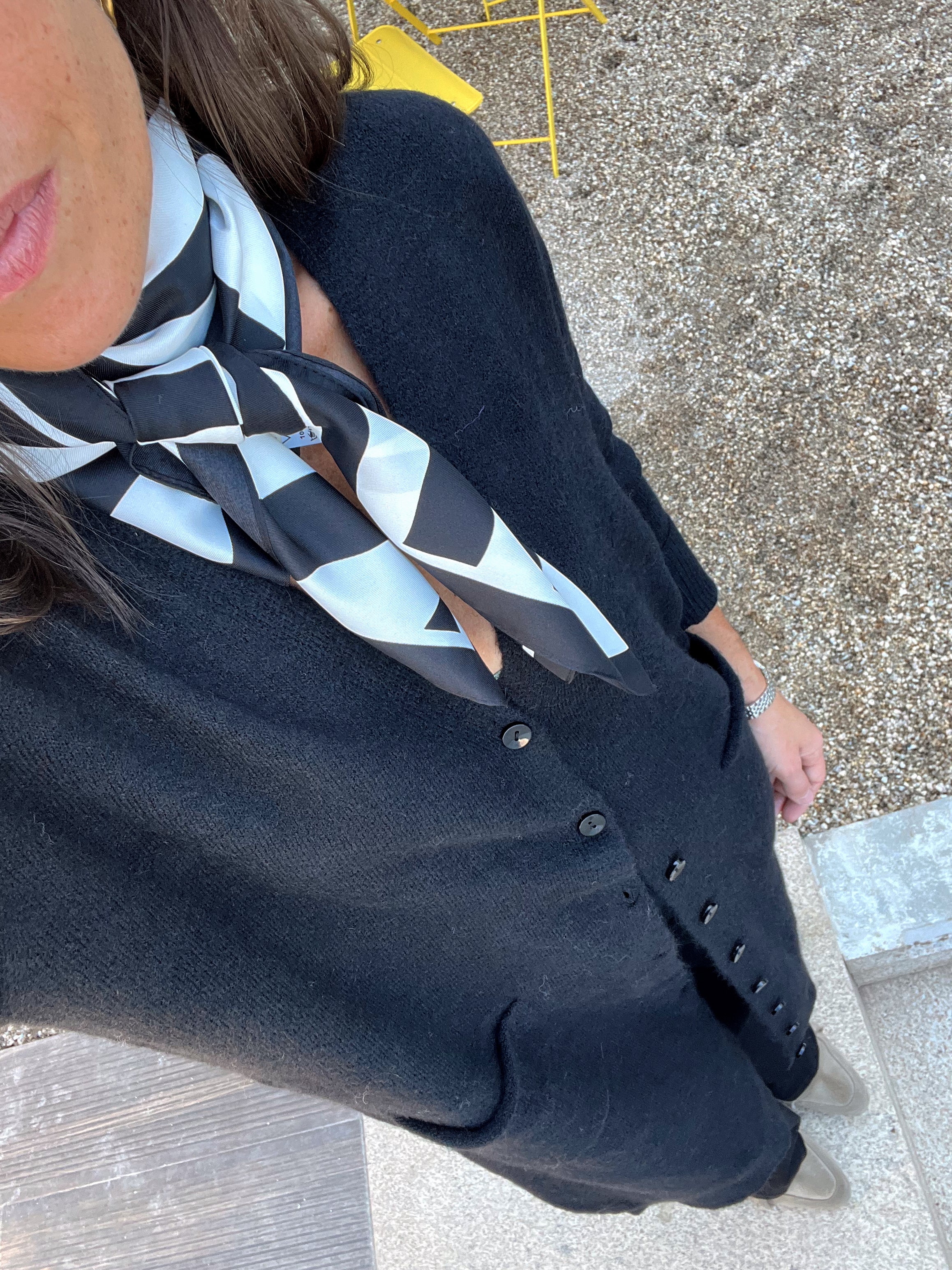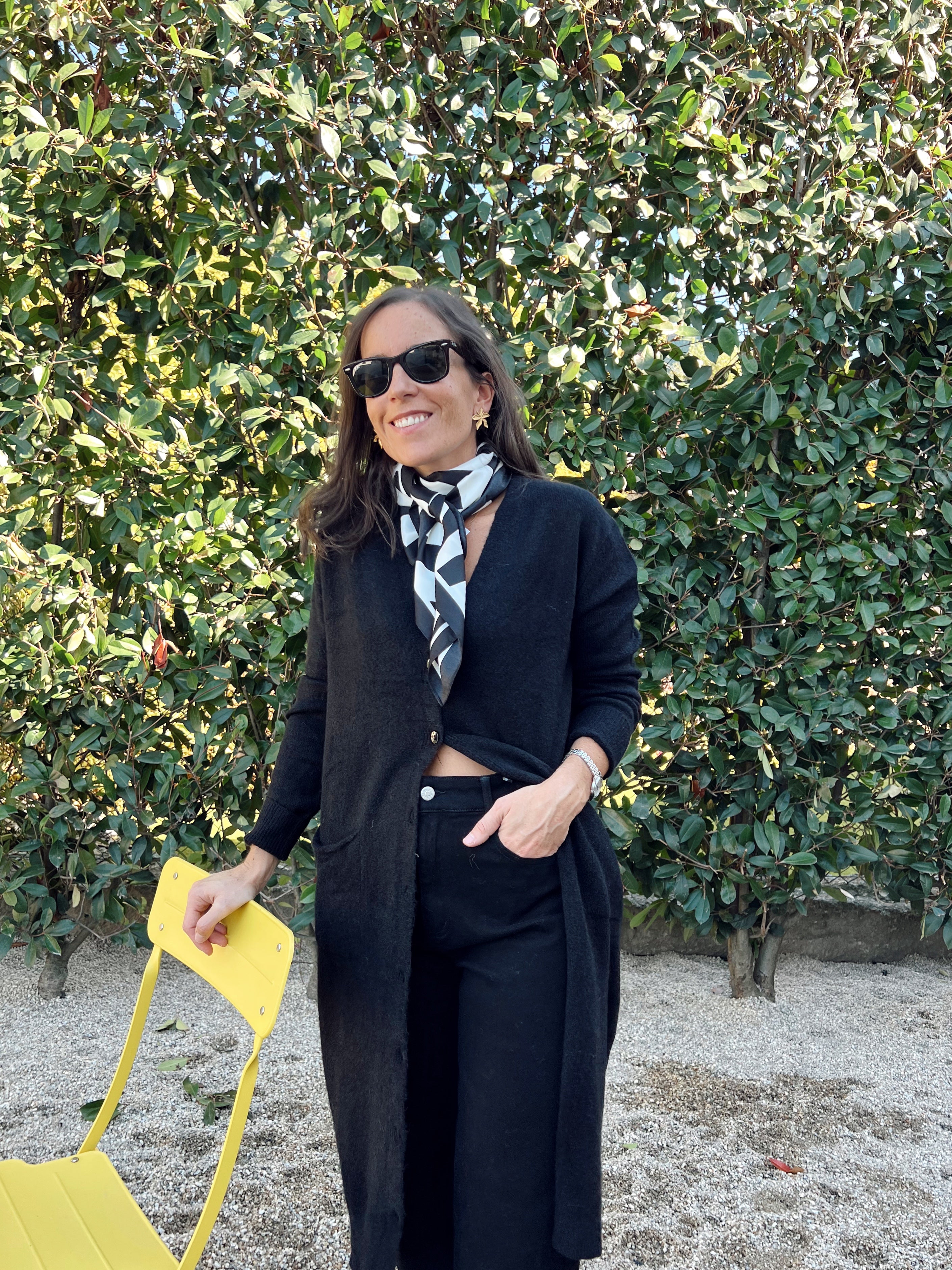 Modelo mede 1.61 e veste o Tamanho 90x90.