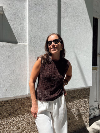 Modelo mede 1.61 e veste o Tamanho Único | 55cm (cava a cava) 58cm (comp.).