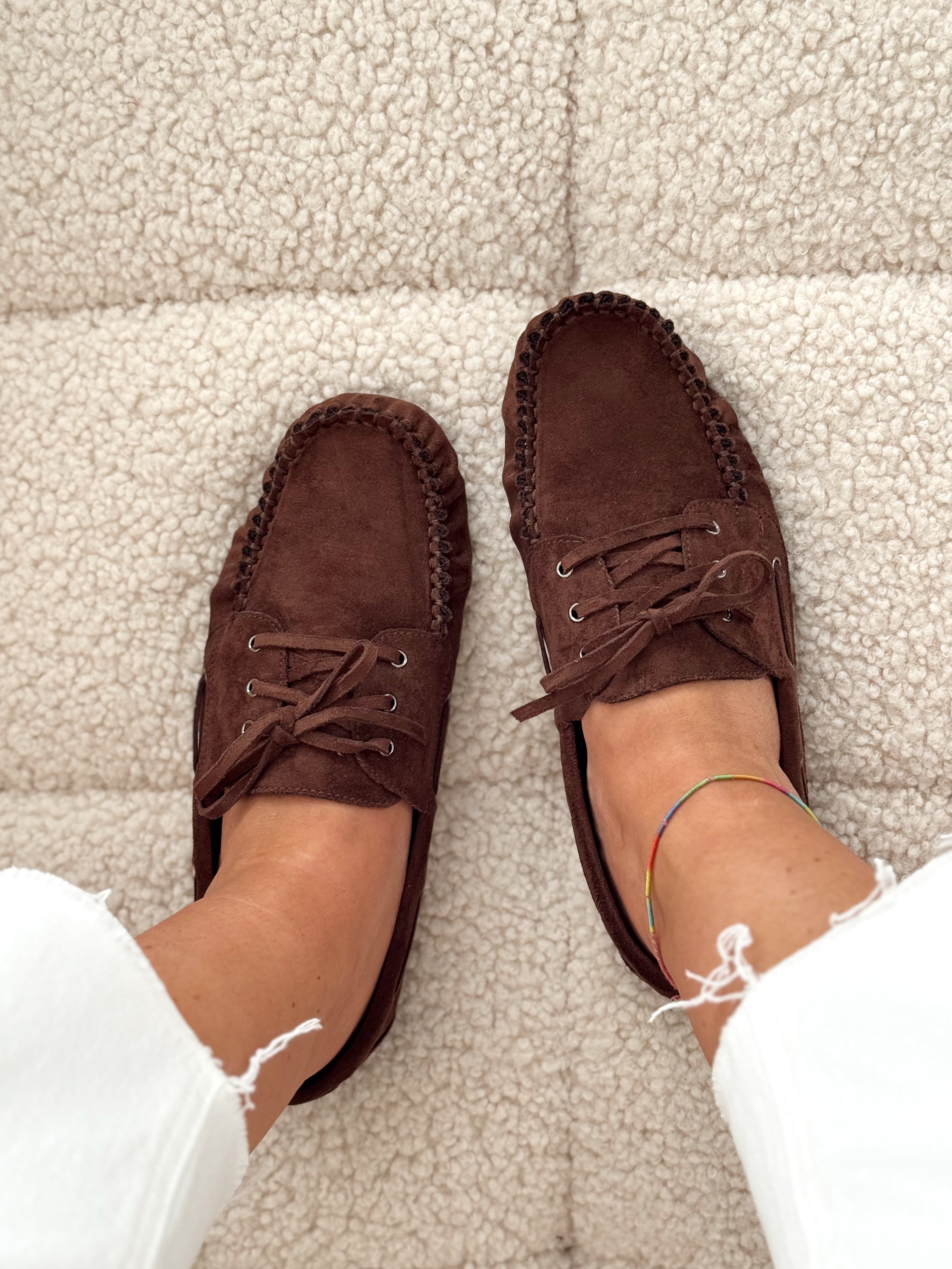 Sapato tipo mocassim em camurça. Detalhe franzido e laço com borlas na parte da frente. Copete subido. Acabamento em ponta redonda.