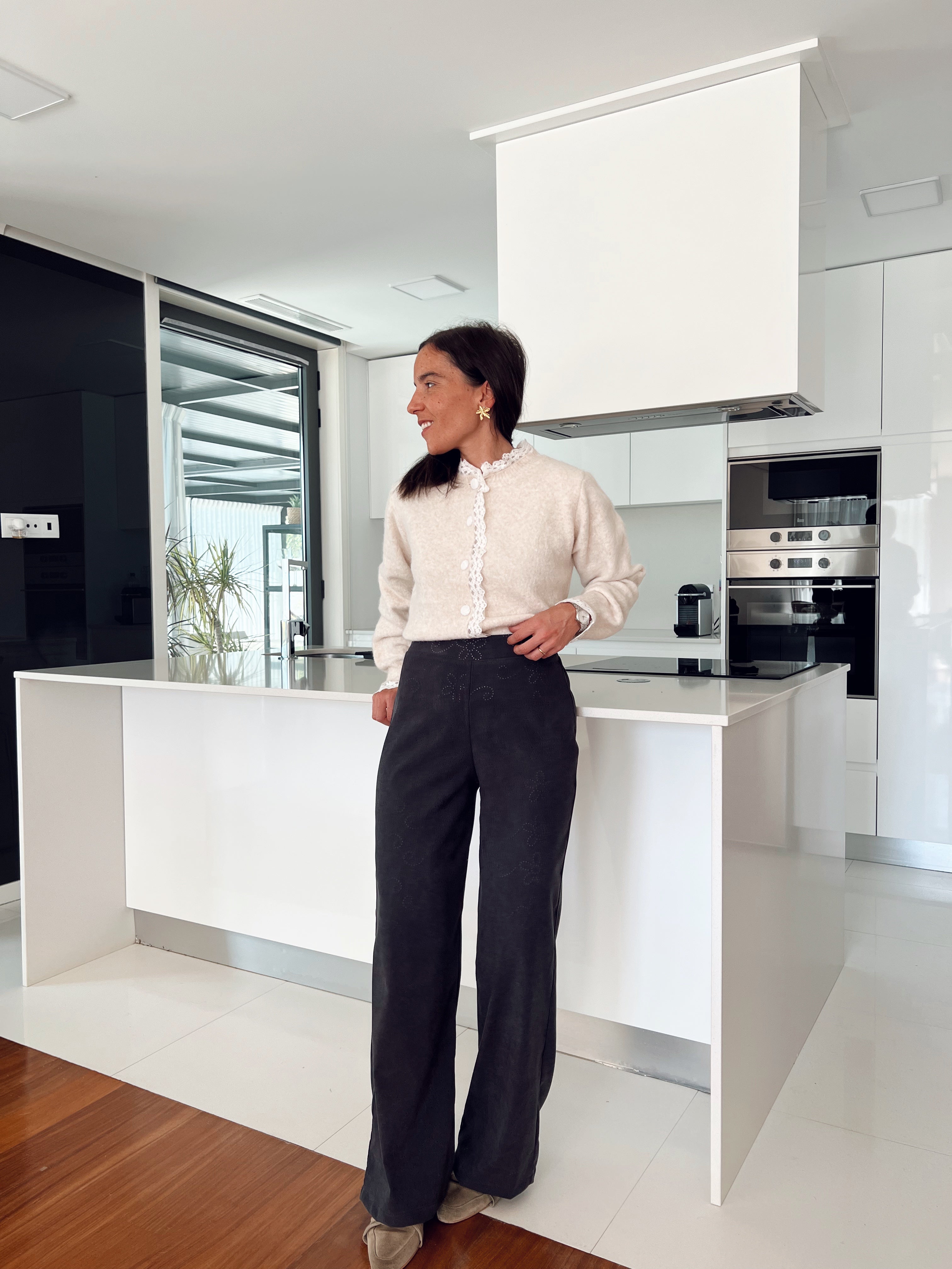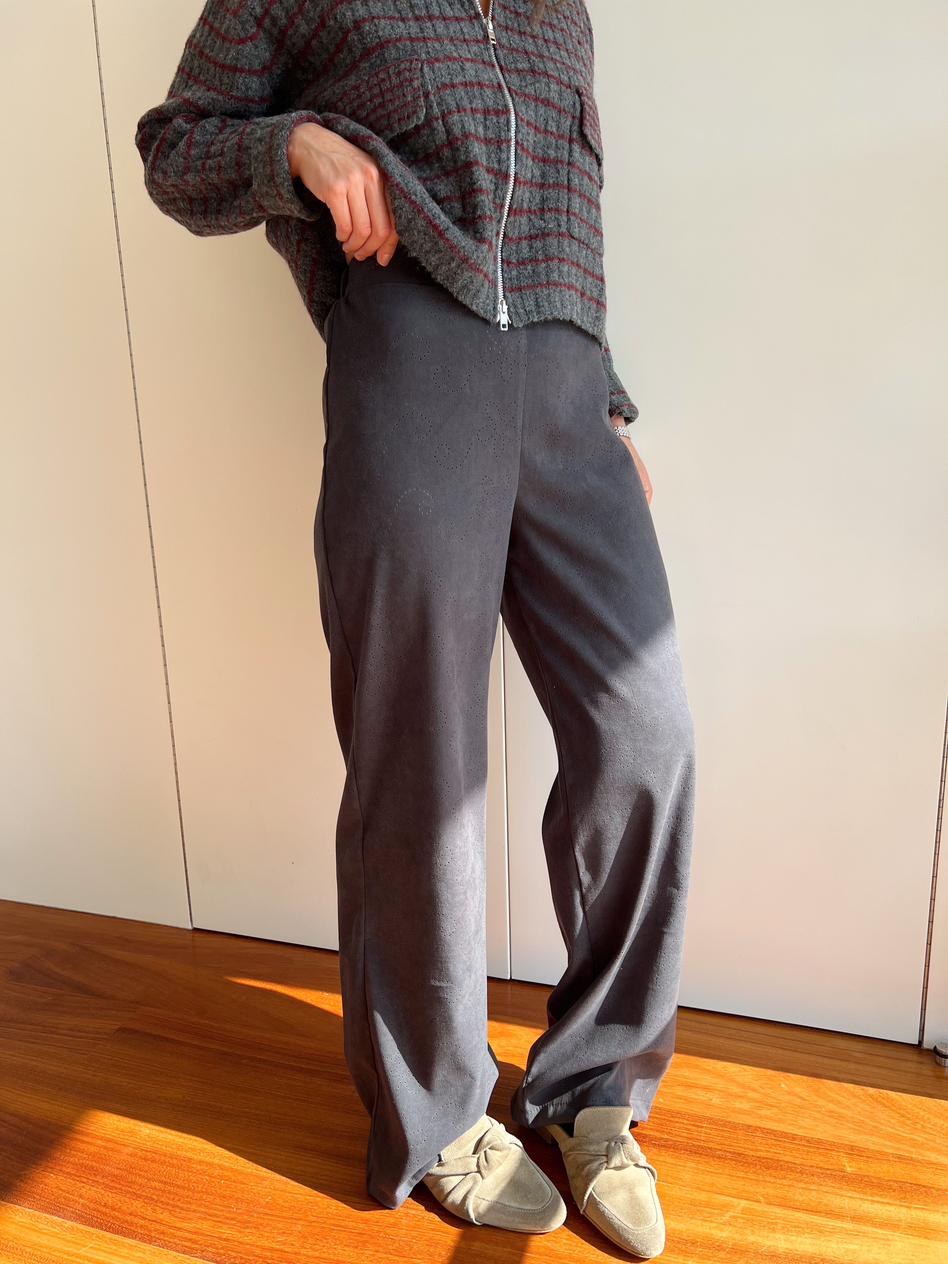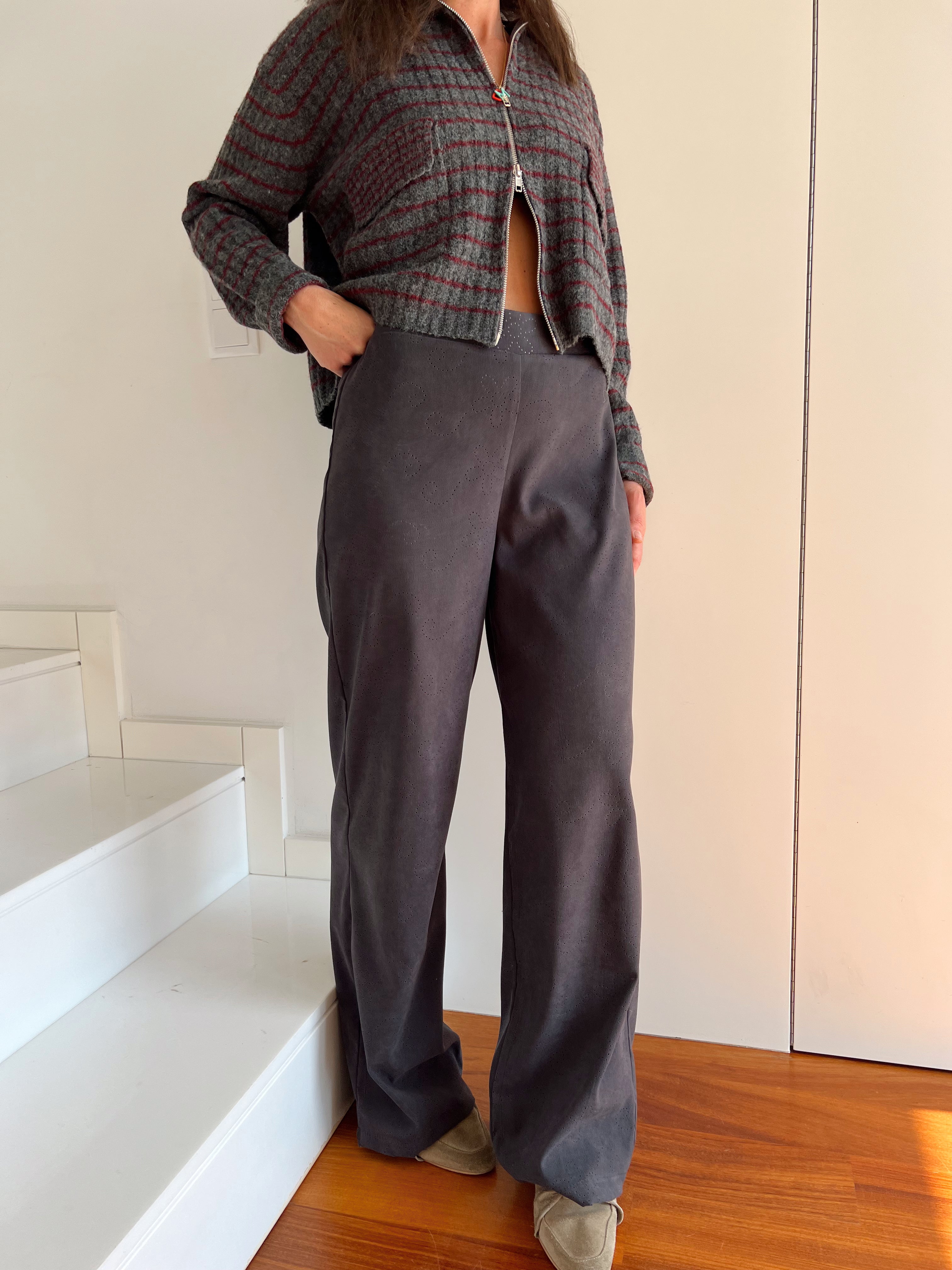 - Calças com elástico na cinta e fecho na lateral.
