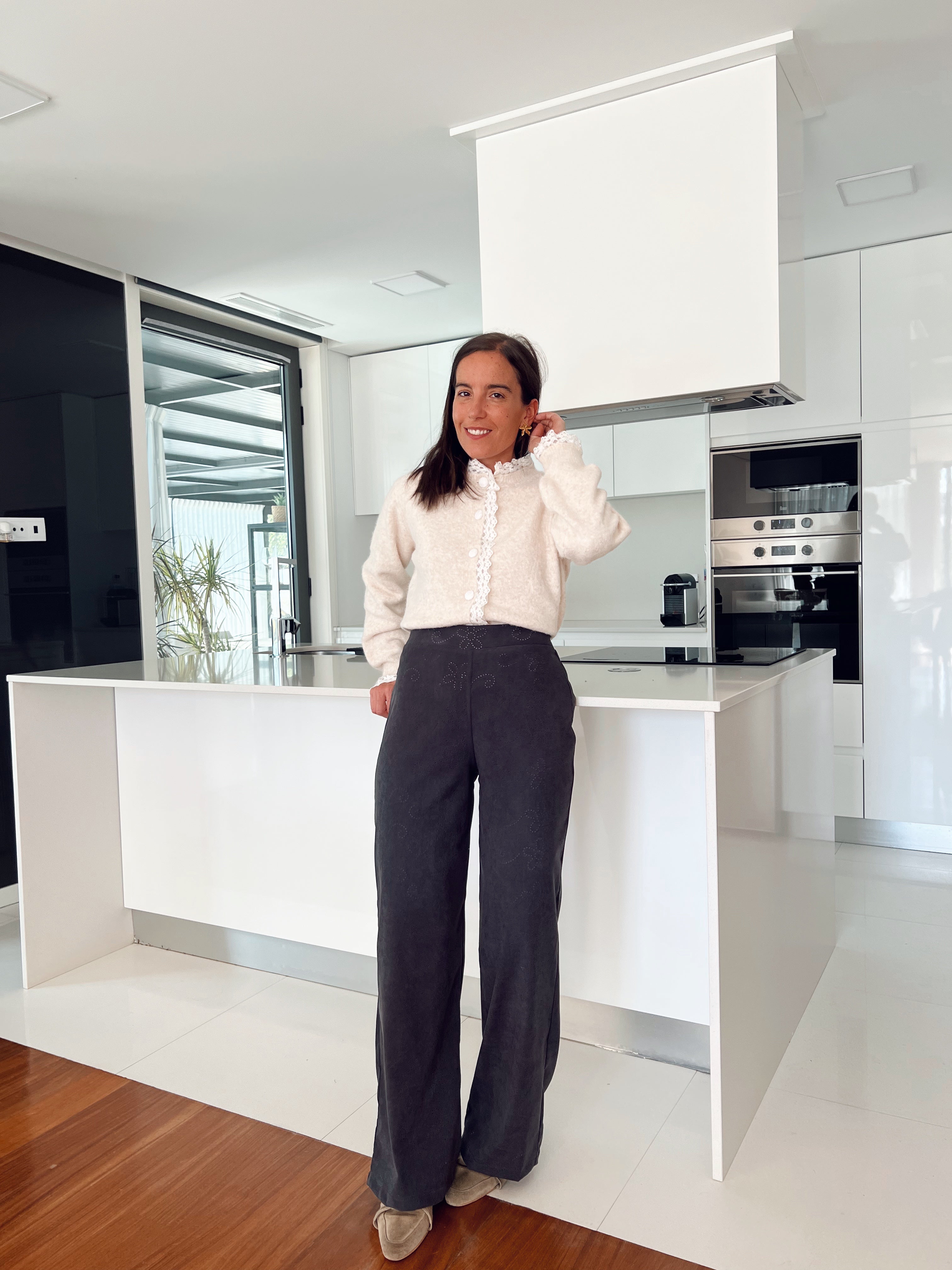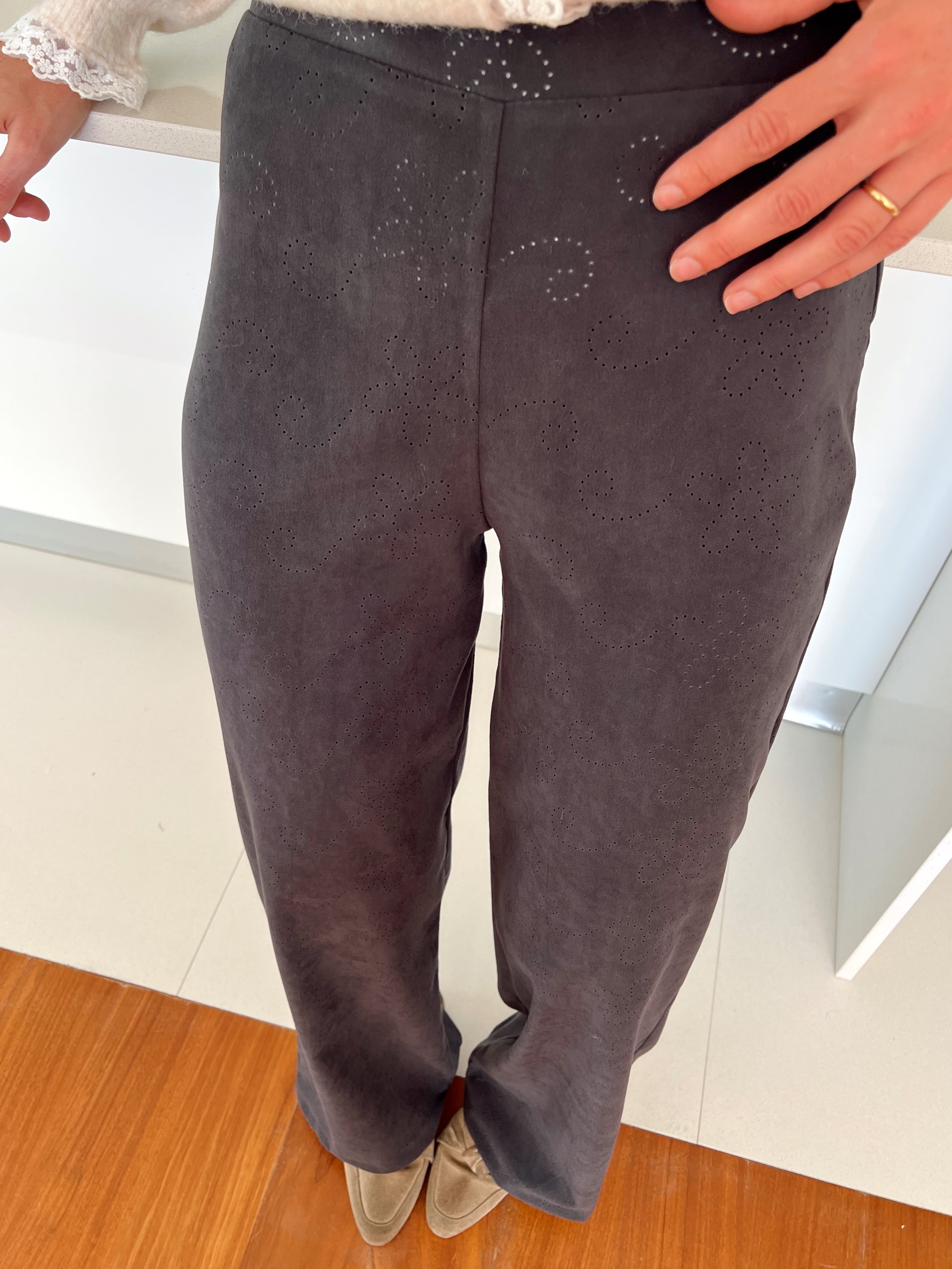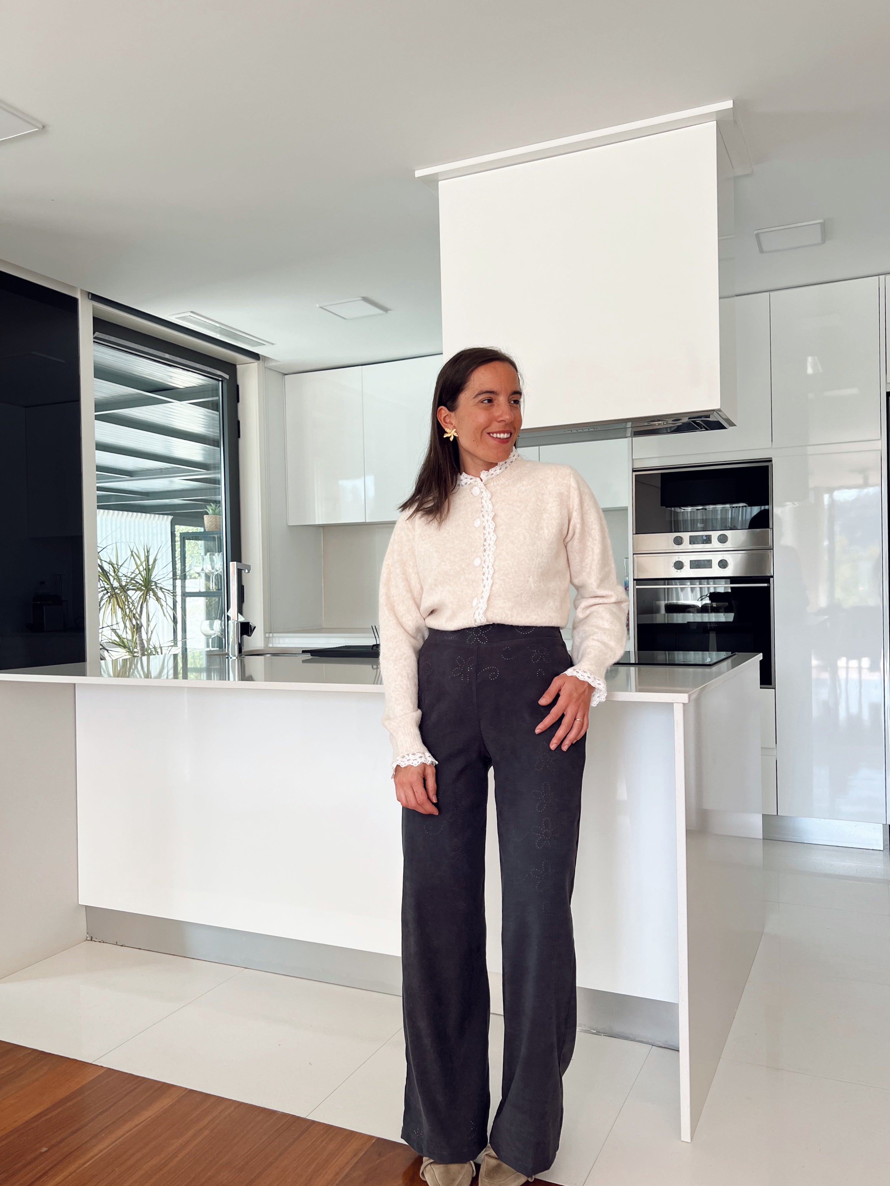 - Calças com elástico na cinta e fecho na lateral.