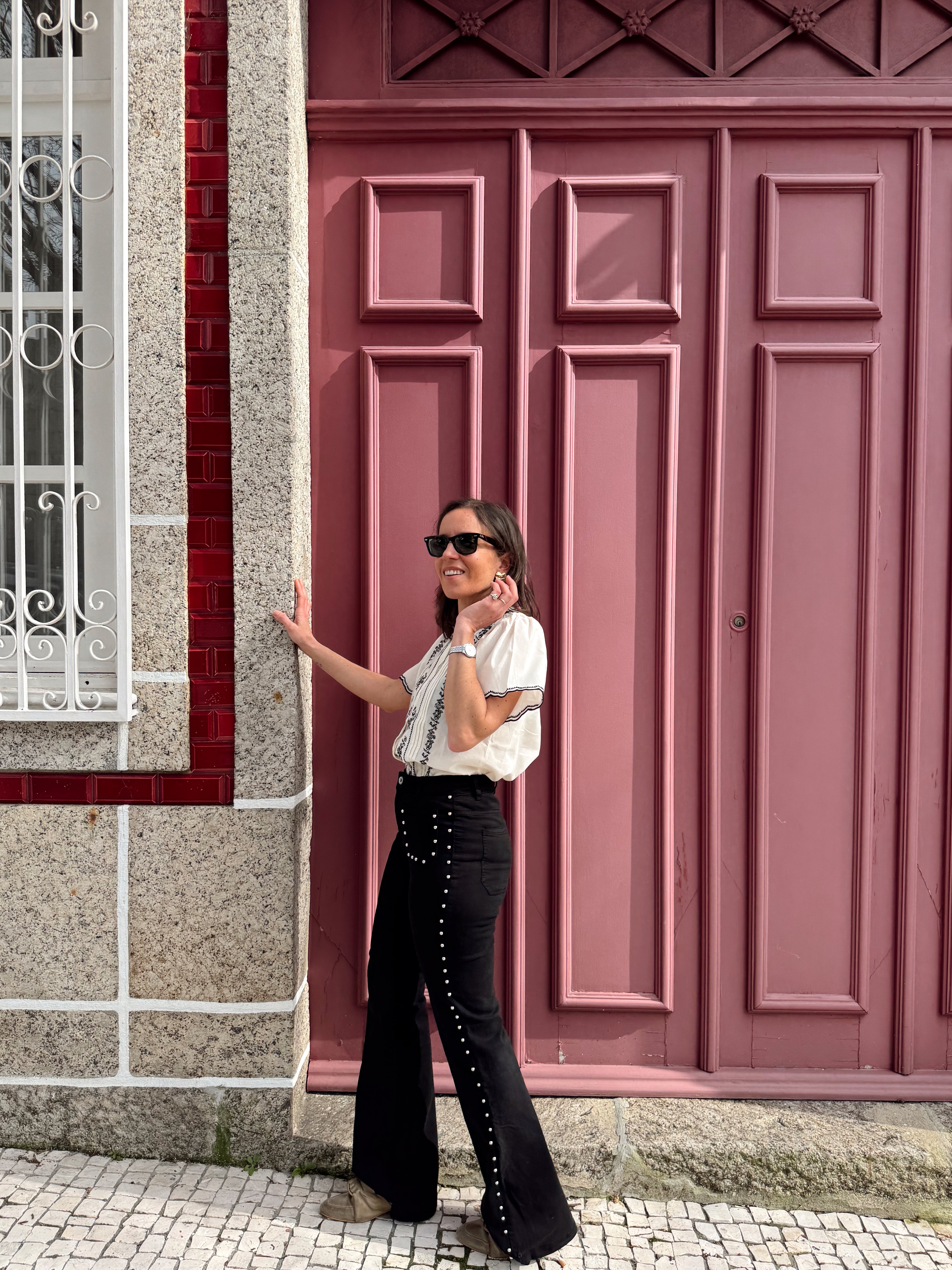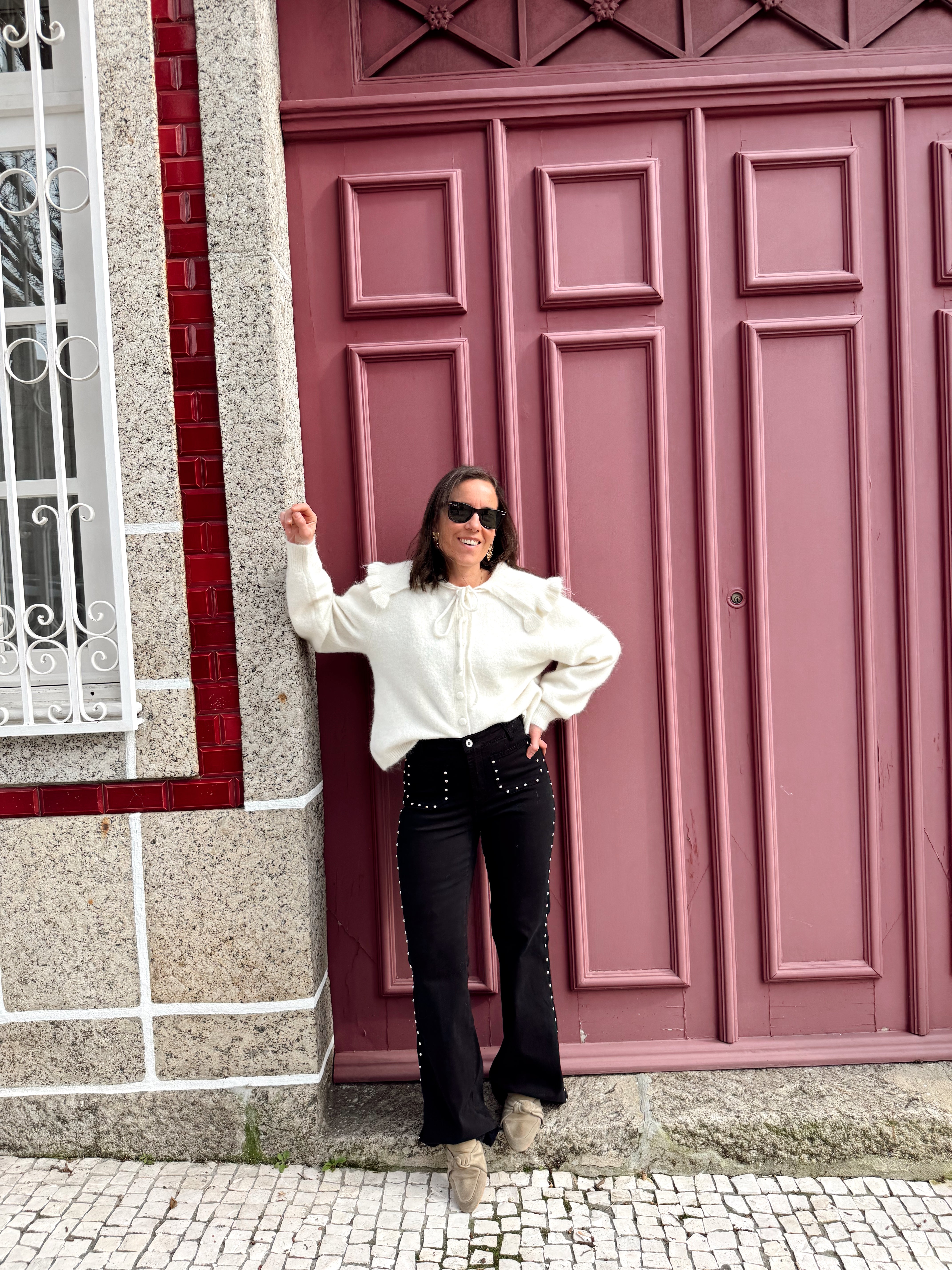 Modelo mede 1.62 e veste o Tamanho 34.